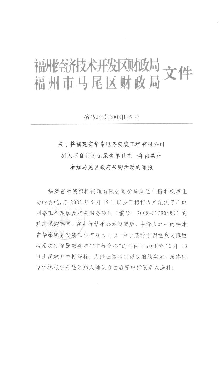 關于將福建省華泰電務安裝工程有限公司列入不良行為記錄名單且在一年內(nèi)禁止參加馬尾區(qū)政府采購活動的通報
